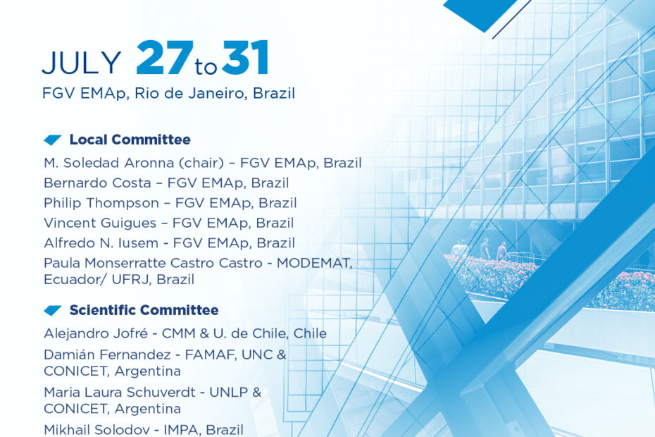 ASAMACI se complace en anunciar la novena edición del Workshop Latinoamericano de Optimizaicón y Control LAWOC 2026 que se realizará en FGV EMAp, Río de Janeiro, Brasil del 27 al 31 de Julio de 2026.… IX Latin American Workshop on Optimization and Control (LAWOC 2026)